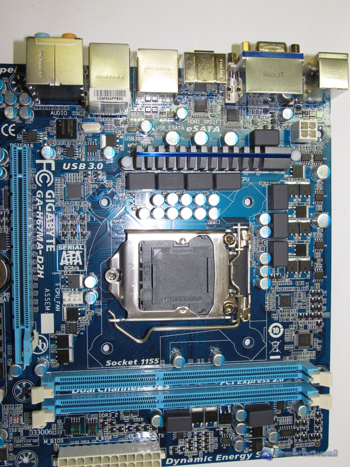 Essendo una scheda piuttosto ridotta nel suo lay-out, rileviamo che la zona socket (LGA 1155) risulta essere piuttosto ‘compressa’, infatti possiamo notare che gli slots dedicati alle memorie DDR3  sono solo due e situati molto vicini al socket stesso. La massima frequenza supportata è di 1333 MHz, limitazione imposta dal chipset H67. Nei due slot presenti sarà possibile installare fino a 16GB di ram sfruttando moduli ad alta densità.  Poco più in basso invece possiamo notare il primo slot di espansione PCIe x16, mentre sopra osserviamo il connettore per l’alimentazione della CPU di soli 4 pin. Ciò non costituirà un grosso problema, visto il TDP ridotto delle CPU Sandy Bridge e l’impossibilità di effettuare l’overclock della CPU.