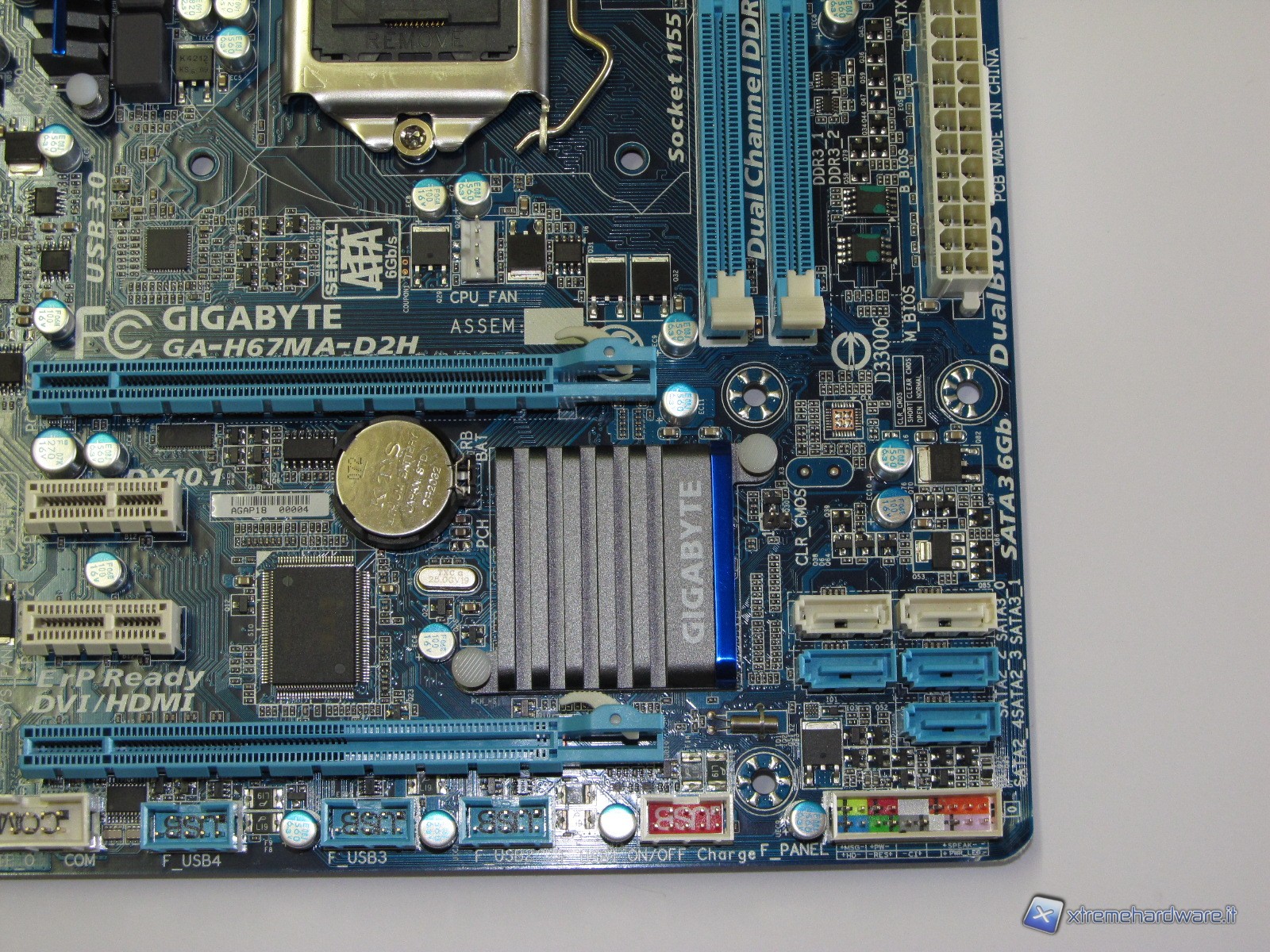 Sulla destra del PCB, oltre al sistema di dissipazione del chipset H67, notiamo 3 porte Sata 3gb/s (celesti) e due porte Sata 6gb/s (bianche), tutte queste sono sistemate sulla mainboard in modo che i dischi vengano connessi verticalmente. Riguardo alle porte Sata, occorre ricordare il recente bug scoperto da Intel sui chipset H67 e P67, che porta in alcuni casi al deterioramento delle prestazioni delle porte Sata 3gb/s. Chi avesse già acquistato questa scheda madre potrebbe riscontrare tale difetto e in tal caso richiedere la sostituzione della scheda tra qualche mese. I nuovi chipset Intel P67 e H67 saranno infatti disponibili per il mese di aprile e nel frattempo Intel ha praticamente bloccato la vendita di schede madri LGA 1155 dei suoi partner commerciarli, onde ovviare ad una costosissima campagna di richiamo per altro già iniziata sul discreto numero di sample già venduto. Per maggiori informazioni vi rimandiamo al comunicato stampa di Gigabyte che potete trovare a questo indirizzo: http://www.xtremehardware.com/news/hardware/comunicato-gigabyte:-come-gestire-le-motherboards-con-chipset-intel-serie-6-stepping-b2-201102024723/