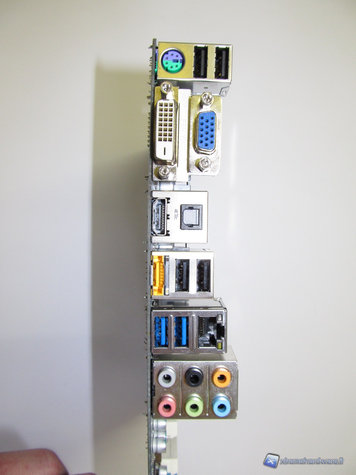 In ultima analisi, diamo uno sguardo  al pannello I/O posteriore, veramente completo. Troviamo infatti 1 porta video analogica (D-Sub), 1 porta video digitale (DVI-D) e 1 porta HDMI (per l’alta definizione), questo per quanto concerne l’apparato video. Infine sono presenti 4 porte USB 2.0/1.1, 1 porta PS/2 ibrida per mouse/tastiera, 1 porta LAN, 1 uscita ottica, 1 porta eSATA per lo storage esterno e  6 uscite per i jack audio.