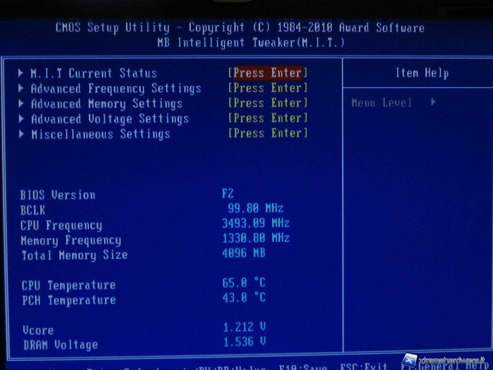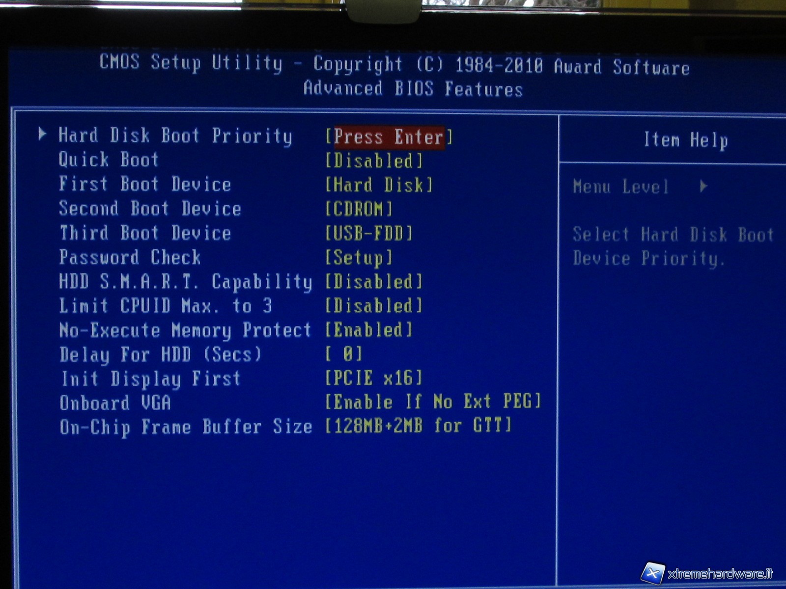 Dopo aver analizzato il layout della scheda madre alleghiamo alcune fotografie relative al BIOS della stessa, sottolineando che essa dispone di una versione BIOS prodotto dalla AWARD, quindi Gigabyte ancora non ha provveduto ad installare su questa scheda madre la versione EFI, la quale a differenza della obsoleta AWARD consente, tra le altre cose, di utilizzare il mouse in ambiente BIOS.
